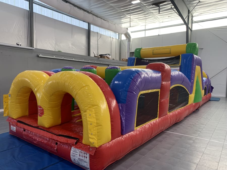 Our commercial-grade inflatables are constructed from 15oz PVC Vinyl with additional vinyl patches sewn in at all stress points to allow for maximum strength, durability and most importantly, safety. The featured "Gator Mouth" system alleviates pressure at 90-degree stress points, adding just another layer of durability to your unit and extending its longevity through the wear and tear of a busy rental season. The slide and sides of the unit are equipped with finger-safe netting that is part of our exclusive "No Jump Top" design™ that ensures that participants only use the slide in a safe manner. The unit has commercial-grade webbing and velcro throughout and zippers for easy deflation when it's time to pack up at the end of the day. This Inflatable Obstacle Course has a maximum weight limit of 1,000 lbs, so it is recommended that only 4 participants are active on the unit at any given time.
