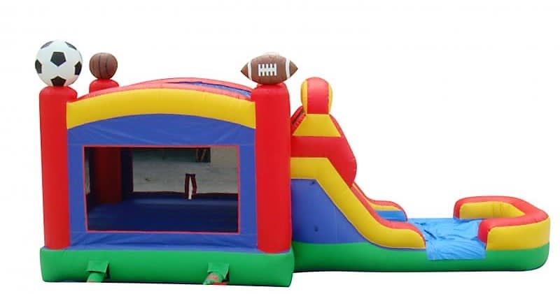 As a key provider of water slide combos in Western Kentucky, we pride ourselves on delivering top-quality inflatables that promise endless fun. This Sports Bounce House Slide Combo is versatile and user-friendly, featuring a built-in misting system that easily connects to a standard garden hose. Transform the bounce house into a refreshing water slide and watch as kids scream with delight as they plunge into the splash pool! Alternatively, keep it dry and enjoy the bouncing fun without water.