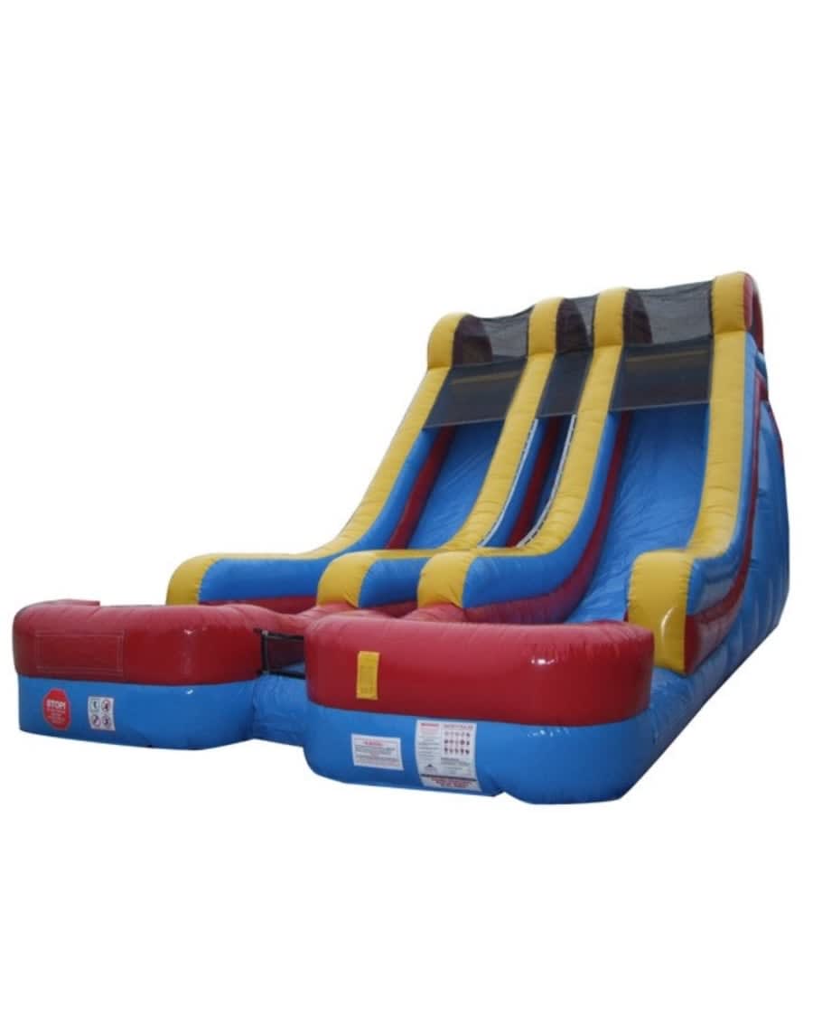 Our Red, Yellow and Blue 18' Double Lane Slide is ideal for a number of outdoor events, including birthday parties, family reunions, Fourth of July celebrations, carnivals, barbecue, fundraisers and more. Whether for personal use, for company outings, or for rental purposes, this inflatable slide will suit your outdoor entertainment needs. This commercial rental quality slide is built with high quality materials that provide a safe and fun experience and a strong, durable unit that will last for multiple seasons of rentals. Our exclusive "No-Jump Top" makes this a safe slide because it forces participants to slide down the slide in the proper manner. We have also reinforced all of the stress points with our exclusive Gator Mouth TM stress reliefs. This prevents tearing at the wall and floor joints. Inflatable. Its special inflatable chambers present a structure that is truly unique.