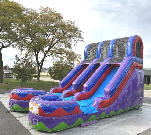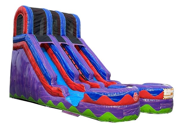 Don't miss out on the opportunity to elevate your next event with our 15'H Dual Lane Purple Slide Wet n Dry. Contact us today to book this crowd-pleasing attraction and make a splash at your upcoming gathering! 🎁