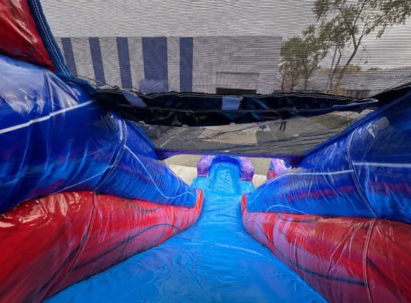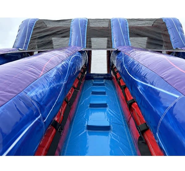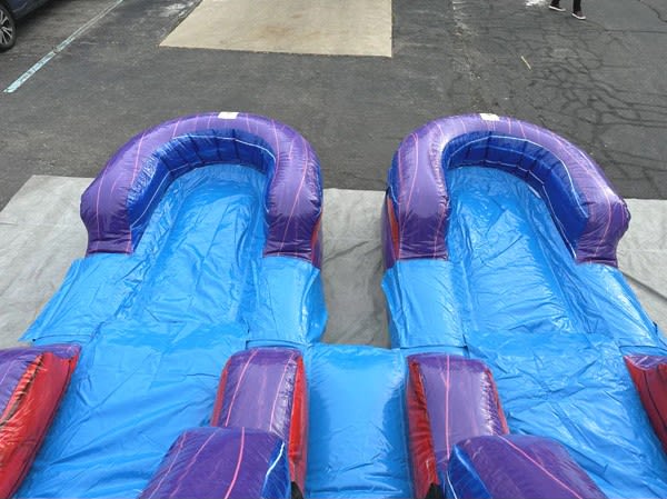 Our 15'H Dual Lane Purple Slide Wet n Dry is perfect for hot summer days, providing a refreshing escape for all guests. The dual lanes allow for friendly competition and racing excitement, adding an extra element of fun to any occasion. Made with high-quality materials, this slide is durable and safe for all to enjoy. 🎈